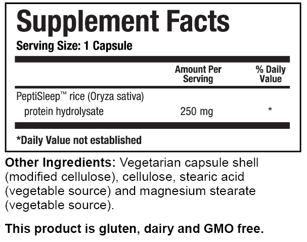 Ingredients: PeptiSleep™ rice (Oryza sativa) protein hydrolysate, vegetarian capsule shell (modified cellulose), cellulose, stearic acid (vegetable source) and magnesium stearate (vegetable source).